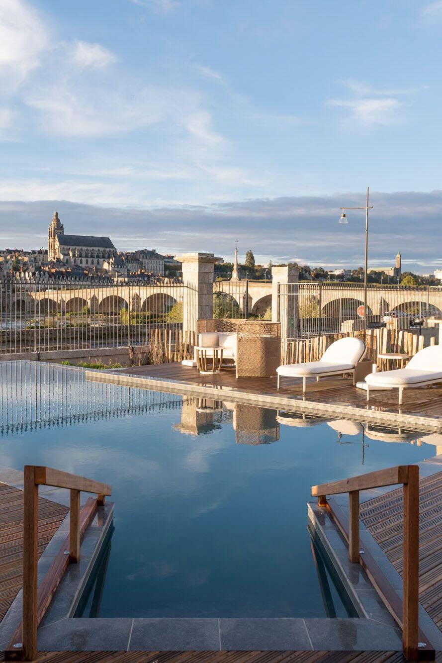 Dette spahotellet er en liten perle i utkanten av Blois: et tidligere hospits fra 1600-tallet som vender ut mot Loire-floden, og som nylig er forvandlet til et 5-stjerners etablissement. Besøkende blir ønsket velkommen som i et stort familiehjem ... versjon grand luxe. Når du kommer inn, blir du lullet inn i en myk, lys atmosfære. De 44 rommene og suitene på Fleur de Loire er innredet med plantemønstrede veggtepper, pudrede toner og treverk, og byr på en naturlig eleganse. De har det lille ekstra som minner om den nærliggende elven. Restauranten, stedets bankende hjerte, er arbeidet til den tostjerners kokken Christophe Hay, prydet med en grønn stjerne. Kjøkkenet hans forteller historien om landet: grønnsaker fra kjøkkenhagen, linefanget Loire-fisk, hjemmeoppdrettet wagyu-biff, trøfler fra Sologne, kaviar... For en mer avslappet atmosfære kan du gå til Amour Blanc, en elegant bistro hvor du kan dele tallerkener med utsikt over Château de Blois.