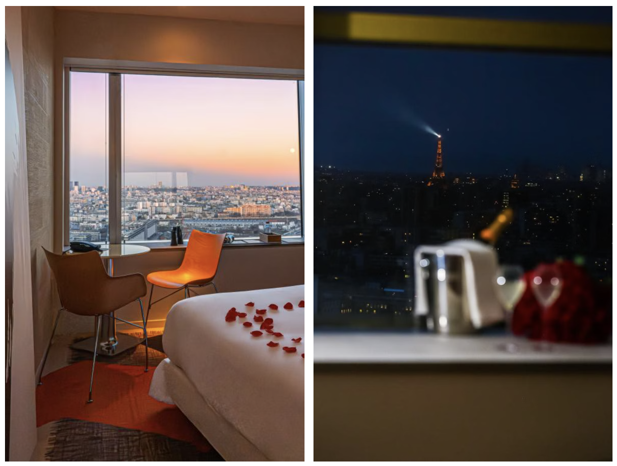 De Valentijnsaanbieding: Het TOO Hôtel & Spa Paris biedt twee formules, TOO Passionate en TOO Idyllic, die een versierde kamer en een dinerervaring combineren. De eerste formule biedt een diner in het TOO Restaurant, een glazen kubus ontworpen door Philippe Starck, waar chef-kok Benjamin Six een verfijnde keuken serveert, onderbroken door desserts van Pierre Hermé, en dit alles met een panoramisch uitzicht over Parijs. De tweede neemt de avond mee naar TOO Tactac, met zijn eigentijdse tafel met Aziatische invloeden. Vanaf 21.00 uur is er een dj-set die de avond in een feestelijke stemming brengt.