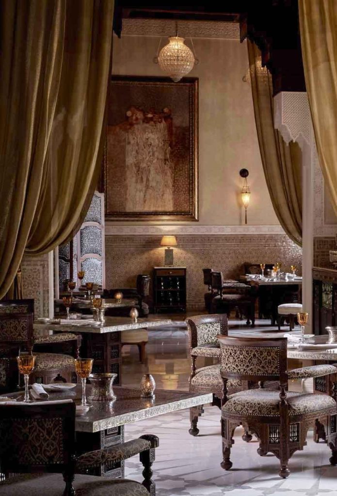 Weelde is hier aan de orde van de dag: Venetiaanse kroonluchters, fluwelen en zijden sofa's, boeketten bloemen. Het decor is gebaseerd op Arabisch vakmanschap en verwijst naar de plaatselijke architectuur, met zuilengangen die gasten door marmeren patio's leiden. Deze prachtige omgeving wordt aangevuld met professionele service. Er zijn 3 restaurants (internationaal, Marokkaans en een zwembadpaviljoen), een bar en een schitterende Vitalité Chenot spa, een van de slechts vier ter wereld, in een replica van het Topkapi Paleis. Bezoekjes aan de stallen van eigenaar Abdeslam en shows met volbloedpaarden zijn een echte traktatie.