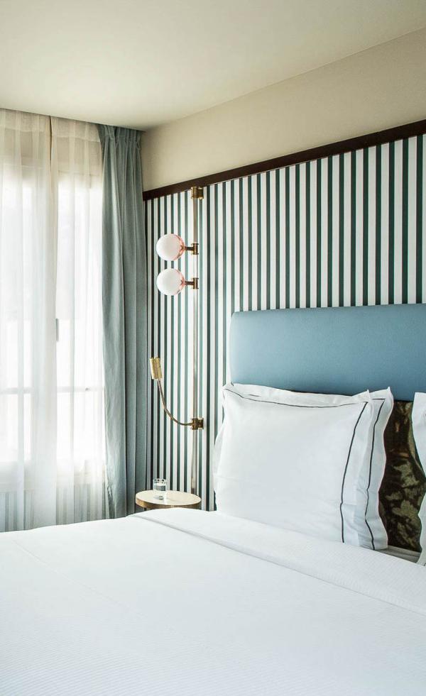 Owner of three five-star hotels in Paris: the Saint James Paris, the Relais Christine and the Norman, Bertrand Hospitality added the Château des Fleurs to its portfolio a few months ago. Housed in a classic 1910 building just a stone's throw from the Champs-Élysées, the boutique hotel is named after the wonderful Armide Gardens on the same street, owned by the king of Parisian parties in the late 19th-century, Victor Mabille, where grand balls were held. This 37-key boutique-hotel, designed by Barcelona-based architects Quintana Partners, gives the five-star hotel the feel of a family home, with a sprinkling of Art Nouveau inspired by Belgian Victor Horta and Scottish Charles Rennie Mackintosh. In the bedrooms, the atmosphere is resolutely cosy, thanks to rounded headboards, textured wood and Murano glass lamps designed exclusively by Quintana Partners for the essential touch of color. And let's not forget a few nods to Paris: the cane-patterned carpet, the terracotta tiles in the bathroom, and the flowery planters that adorn all the windows. The best part? sleeping under the roof in one of the duplex Junior Suites on the 5th floor.