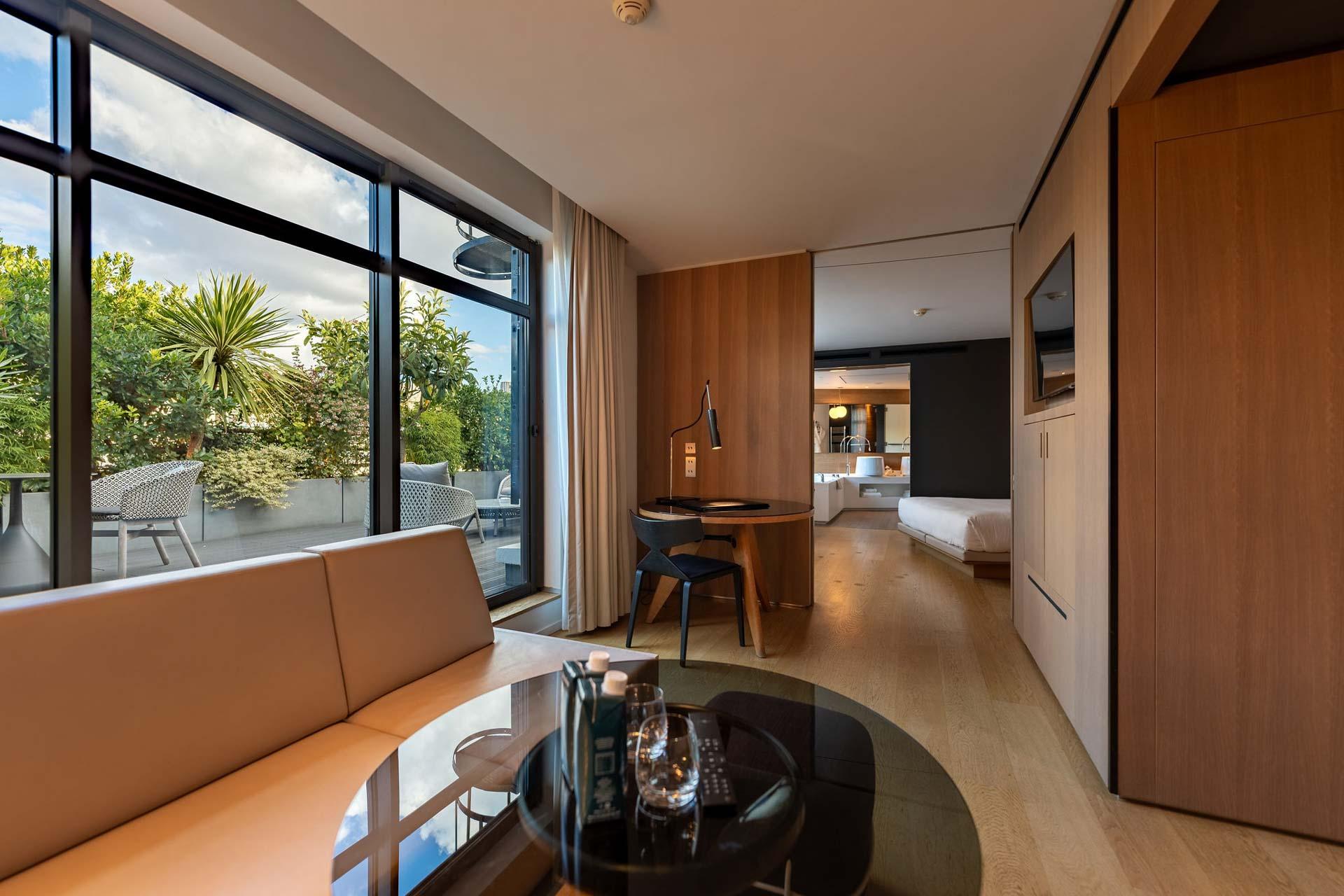 Shades of gray, polished concrete, plush velvet, and geometric mirrors create a cozy atmosphere that is the quintessence of Parisian chic. Some suites, peaceful retreats nestled under the eaves or featuring long balconies, offer breathtaking views of the 1st arrondissement without ever being affected by its hustle and bustle.