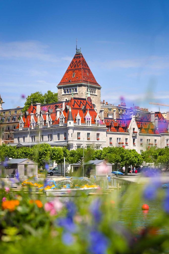 Although the origins of the château date back to the 12th-century, the hotel as we know it today was built in 1885. An impressive neo-Gothic building, bordered on both sides by the Alps and the lake, the establishment boasts some 50 cosy rooms, with occasional nods to the heritage of the site, in the form of a four-poster bed, period woodwork or a sumptuous sculpted ceiling. With a swimming pool, sauna and hammam, the spa is straight to the point, and guests can enjoy the facilities of the neighboring Beau-Rivage Palace (see above) at a preferential rate. The 57° Grill, the hotel's restaurant, plays the modern card, appropriating the codes of New York grills. The menu features a fine selection of meats from the Swiss Alps, local poultry and fish straight from Lake Geneva.